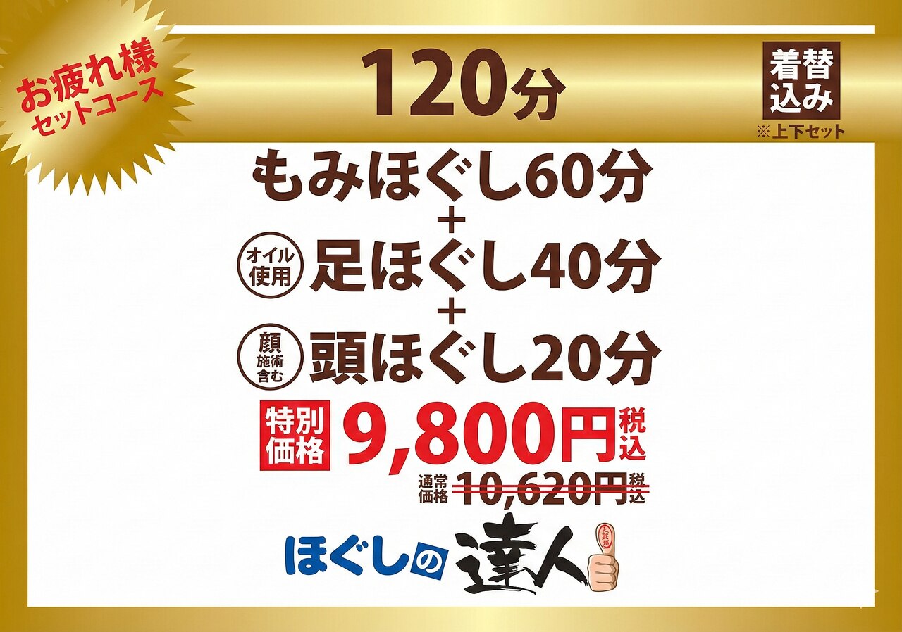 もみほぐし(体ほぐし)と足ほぐしを組み合わせたお得なセットメニューです。足ほぐしとのセットメニューは、上下のお着替えが無料となっております。